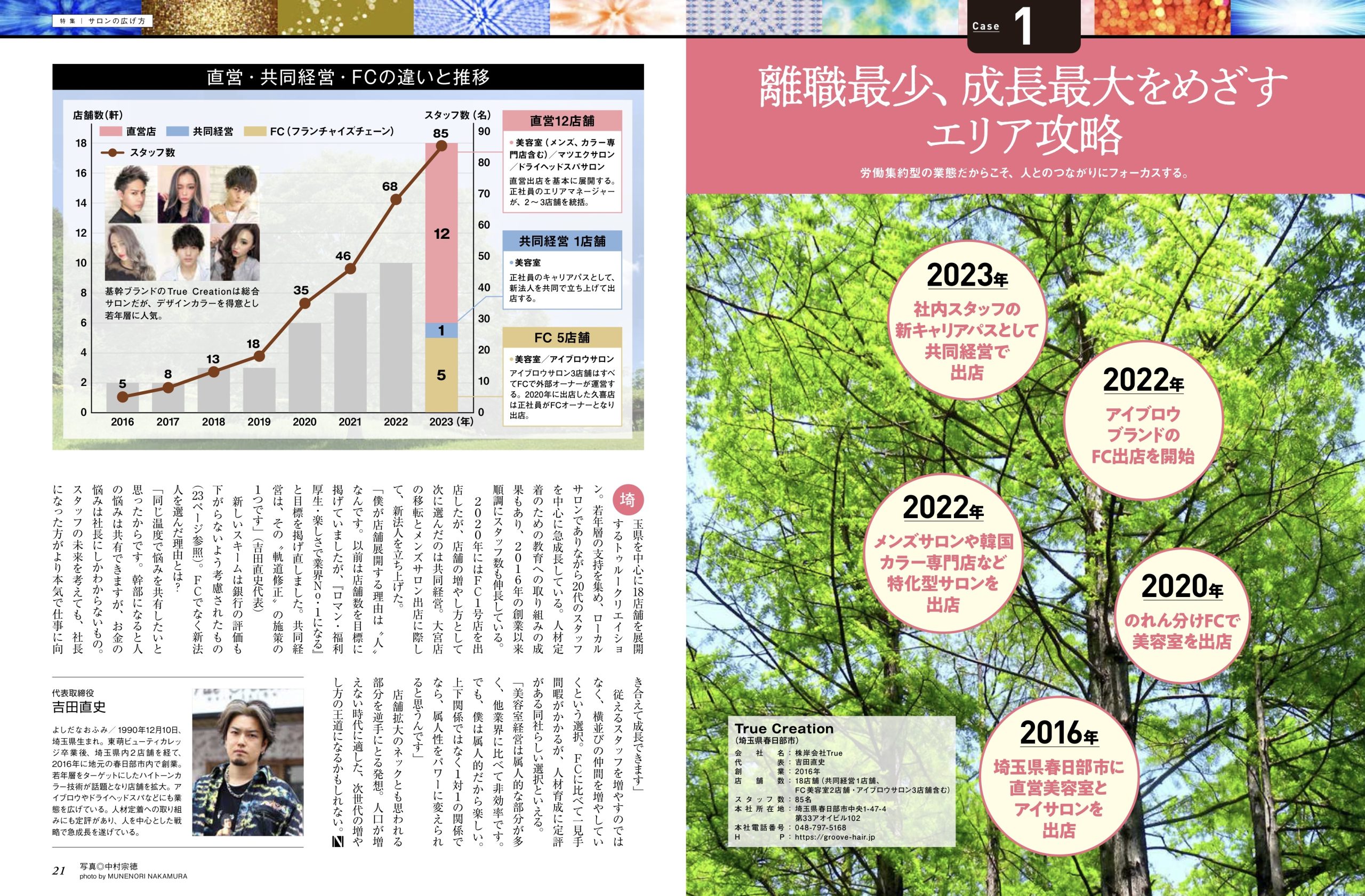 埼玉県を中心に18店舗を展開するTrue Creationは若年層からの支持を集め、急成長中。直営店、FC展開に続き、共同経営という新しい展開パターンも開始。特化型サロン出店によるドミナント化など、多彩な出店スキームを備えている。若いスタッフたちのキャリアパスとしてバリエーションを広げる同社の出店戦略を紹介。
